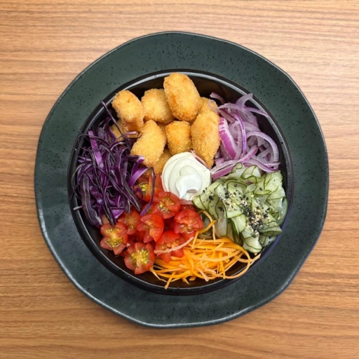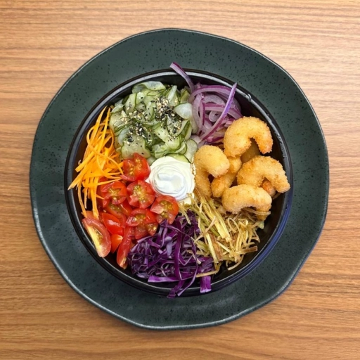 Arroz, camarão empanado, cebola roxa, repolho roxo, sunomono, cenoura, crispies de alho poró e cream cheese.